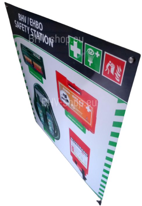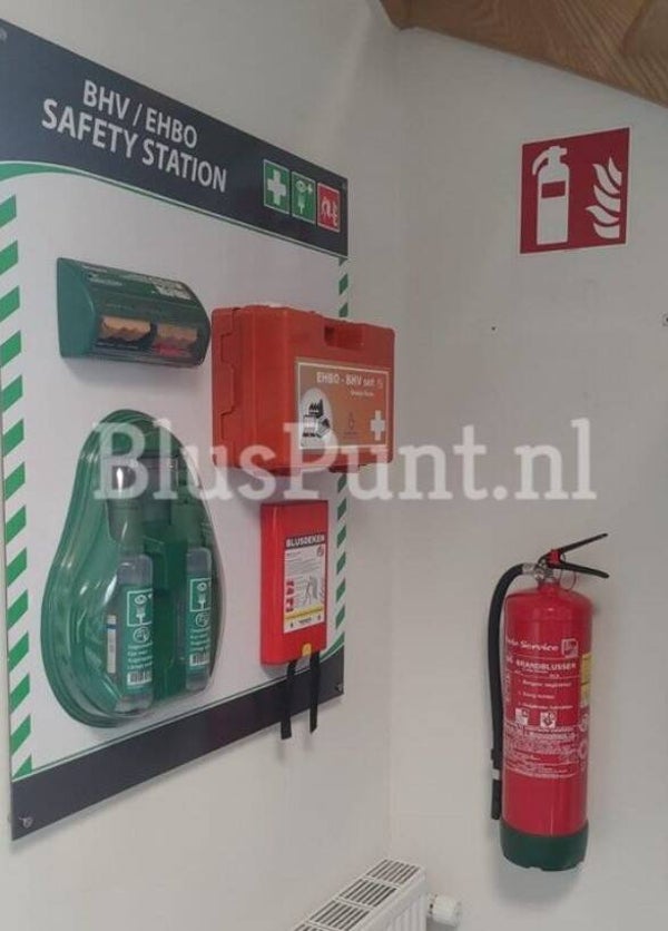 BHV wandbord veiligheidsartikelen. BHV veiligheidsbord van 75x90cm inclusief vier wand afstandhouders. Levering met verbandkoffer, brand blusdeken 1.20 x 1.20 meter oogspoelstation met spiegel en tevens twee flacons 500ml steriel oogspoelmiddel afgedekt met transparante kap voor optimale hygiene, pleisterdispenser met 40 textiel en 45 plastic pleisters. Uw eerste hulp artikelen overzichtelijk en centraal op één bord. Monteer het BHV EHBO artikelen bord op een strategisch punt binnen uw bedrijf of organisatie zoals in de entree, kantine, bij de receptie.. zodat eenieder bij nood hier direct zicht op heeft. De EHBO-artikelen oplossing voor in de industrie, retail, defensie, onderwijs, ICT, research, enz... Bij de bezorging worden de artikelen niet aan het bord maar los en goed verpakt geleverd. Op dit moment heeft dit artikel een levertijd van circa tien werkdagen.