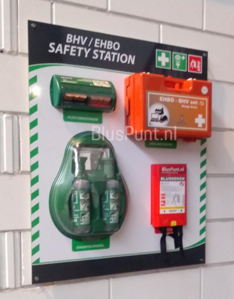 EHBO artikelen wandsysteem Industrie inclusief BHV EHBO artikelen. Modern EHBO wandsysteem met afmeting 75x90cm inclusief BHV EHBO verbandkoffer, brandblusdeken, oogspoelstation met 1x500ml steriele en 1x 250ml Ph-neutrale oogspoeling en pleisterdispenser. Wandsysteem om de BHV EHBO middelen goed zichtbaar, overzichtelijk en centraal op één plaats aan de wand te hebben. Monteer het EHBO wandsysteem voor in de Industrie juist bij werkplekken met een verhoogd risico op letsel. Bij de bezorging worden de artikelen niet aan het bord maar los bijgeleverd. Met kit, tape of popnagels bevestigt uzelf de artikelen aan het bord. In onze webshop nog meer varianten van deze doeltreffende veiligheidsborden.