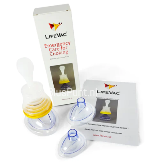 LifeVac anti verstikking pomp aanbieding om blokkade in de luchtweg te verwijderen. De LifeVac unit wordt geleverd inclusief drie maskers. Voor volwassenen, masker voor jong volwassenen en masker voor kinderen. De handleiding (Nederlands) is bijgesloten. De LifeVac is een anti verstikking apparaat waarmee al veel levens mee zijn gered. Eenvoudig in gebruik voor inzet als de standaard BLS procedure voor het verhelpen van een verstikking niet werkt. Bij verstikking plaats je het masker van de LifeVac over de neus en mond van het slachtoffer. Na het naar beneden bewegen van de handgreep kan door een snelle beweging omhoog de blokkade uit de luchtweg worden verwijderd door middel van de zuig (vacuum) kracht die de LifeVac genereert. De LifeVac is zelfs ook op jezelf te gebruiken. En verslikt zich iemand? Bijvoorbeeld binnen uw bedrijf huisartsenpraktijk gezondheidscentrum, evenement of elders? LifeVac biedt uitkomst. In de webshop meer aanbieding varianten van LifeVac anti-verstikking tool.