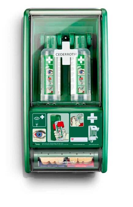 Uw eigen strategisch te positioneren eerste hulp afdeling. EHBO wandpaneel biedt de mogelijkheid om snel EHBO te kunnen verlenen. Met dit innovatieve EHBO station heeftt elke werkplek een doeltreffende en compacte eerstehulpafdeling om zo snel mogelijk in te grijpen wanneer zich een ongeluk met letsel voordoet. Het oogdouchestation is ontworpen om snel hulp te kunnen bieden. Het station heeft plaats voor twee oogspoelflessen die automatisch worden geopend wanneer je ze uit de houder haalt. De oogspoelflessen zijn zo vormgegeven dat het oog gedurende ca. 1.5 minuten goed kan worden doorgespoeld.