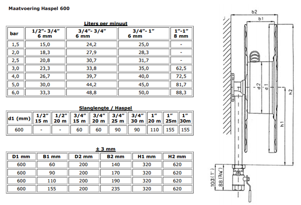 - afmeting haspelbladen: 600mm Ø (diameter)
