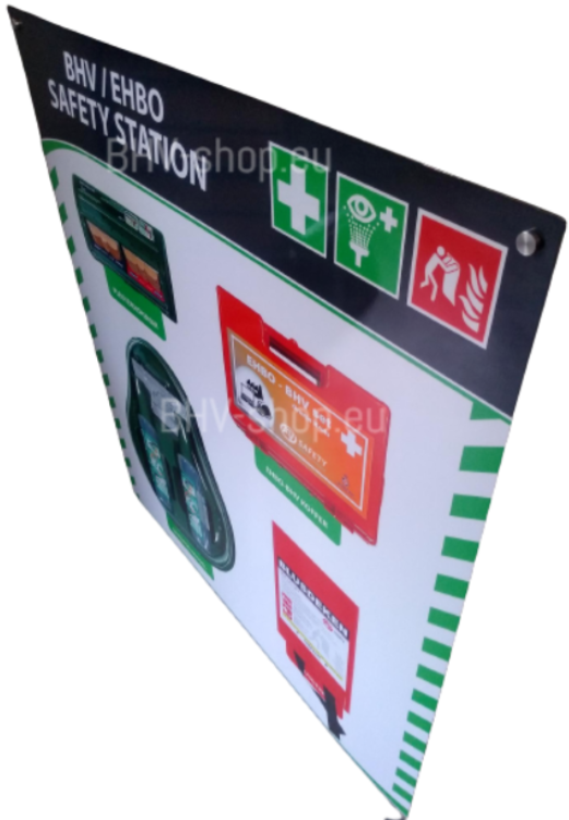 Veiligheidsbord maakt het mogelijk om BHV EHBO artikelen overzichtelijk bij elkaar aan de wand te hangen. Vanwege de bekende opvallende kleuren van de BHV EHBO artikelen en striping op het bord wordt deze oplossing direct met aanwezigheid van bedrijfsveiligheidsartikelen geassocieerd. Het veiligheidsbord laat zien dat u de algemene veiligheid binnen uw organisatie op orde heeft. Het veiligheidsbord is vanuit de RI&E aan te raden omdat bij bedrijfscalamiteiten met letsel tijdwinst wordt geboekt. Er hoeft niet naar een ergens rondslingerende verbandkoffer of pleisters te worden gezocht. Er gaat geen tijd verloren wat bij beperken van letsel ontzettend belangrijk is. De wandplaat van 3 of 4 mm dik bestaat voor 90 procent uit kunststof met aluminium als toplaag. Aluminium buitenzijden met daartussen kunststof. Neem het veiligheidsbord op in uw BHV-plan. In de webshop meer AED BHV EHBO artikelen en EHBO-wandsystemen.