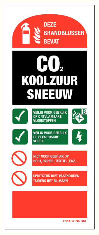 Pictogram Co2-brandblusser. Brandblusser pictogram bevat gebruiksaanwijzingen en uitleg op welke branden Co2-brandblussers geschikt zijn. Deze pictogrammen zijn met name voor niet geoefende personen een uitkomst. De korte tekst op het Co2 brandblusser pictogram bord wordt in combinatie met symbool brandklassen afbeeldingen verduidelijkt. Het Co2-brandblusser pictogram heeft de afmeting van 80x200mm en wordt naast de Co2-blusser aan de wand bevestigt. Co2-blussers zijn ontworpen voor het adequaat blussen van beginnende elektriciteitsbrand in onder spanning staande apparatuur, installaties, vloeistoffen en vloeistoffen die door verhitting vloeibaar worden. Toepassingen van Co2-brandblussers, die ook wel koolzuurgas en koolzuursneeuw brandblussers worden genoemd, vinden we vooral in grootkeukens en computerruimten. Online brandblusser pictogrammen bij BlusPunt Brandblussers bestellen biedt gemak, is eenvoudig en veilig per IDeal.