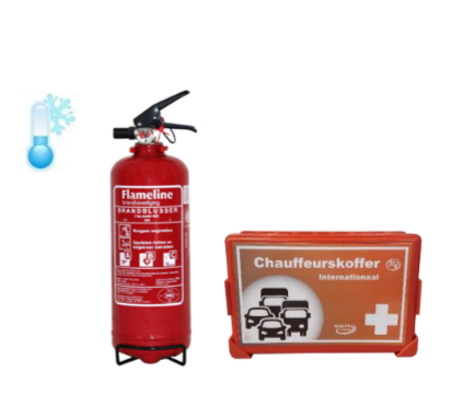 VCA bedrijfsvoertuigen set bestaande uit verbanddoos met houder en robuuste poederblusser met 2-kilogram inhoud. Deze verbanddoos bevat inhoud conform Internationale regelgeving en voldoet aan de Europese richtlijn (DIN-13164). Met deze stevige verbanddoos met dubbelclips sluiting bent u onderweg van de juiste EHBO middelen voorzien en voldoet u aan de vereisten vanuit de VCA. De poeder blusser heeft het Rijkskeurmerk en wordt geleverdt met stevige montagebeugel. Het bluspoeder is bestand tegen zeer lage vriestemperaturen tot maar liefst -30 graden.