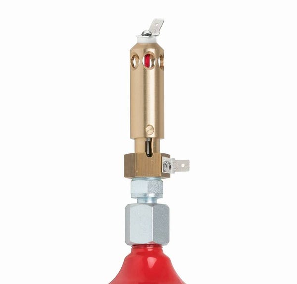 Automatische brandblusser met intelligente glasbulb. Op de glasbulb bevindt zich een lint. Wanneer het normally-closed contact lint bij activatie van de automatische glasbulb brandblusser onderbroken raakt kan doormelding via verschillende signaalgevers worden gegeven. Uw huisinstallateur kan u hierin adviseren. Met de deze mogelijkheid tot doormelding wordt het mogelijk om de locatie van de brand snel aan te geven. Glasbulb brandblusser met standaard 6,3mm klemmen geschikt voor signalen van 24V/48V en 1000mA.